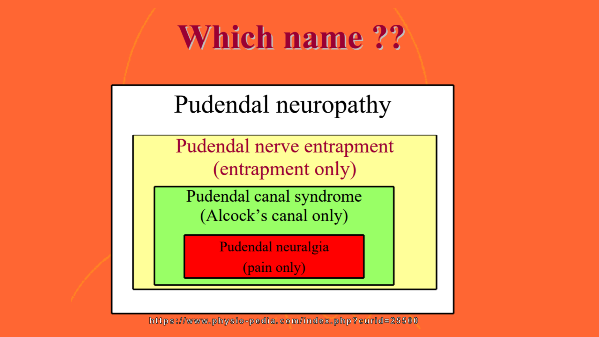 The term 'Pudendal' comes from Latin, Pudenda, meaning “external genitals”, derived from pudendum, meaning "parts to be ashamed of".